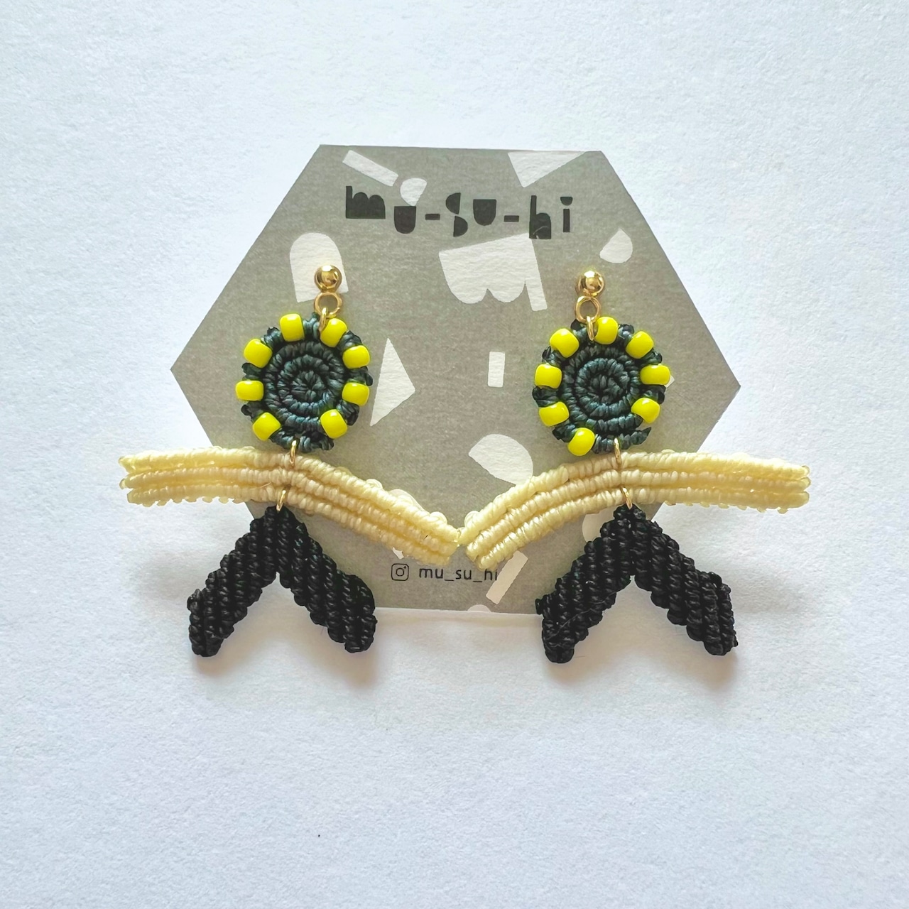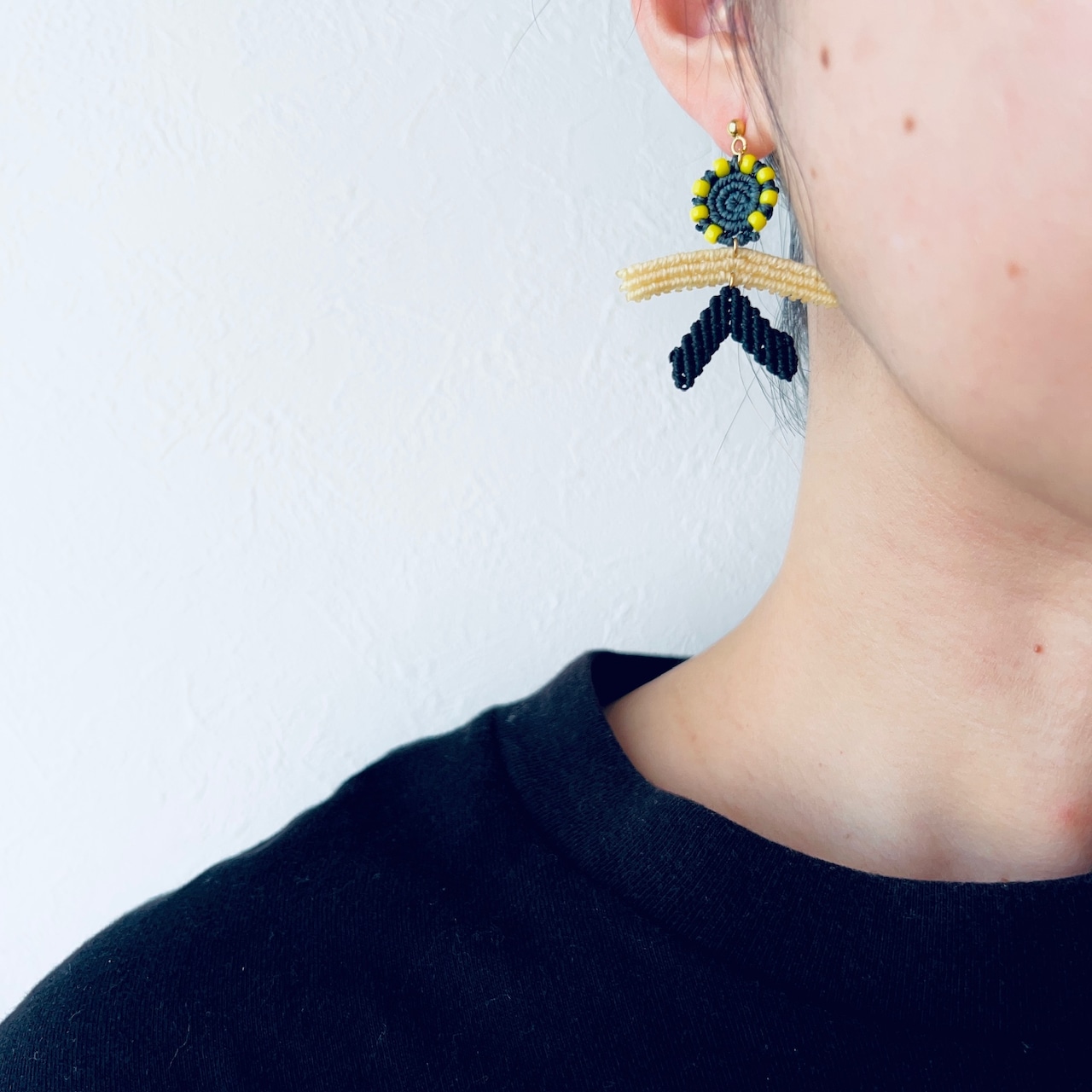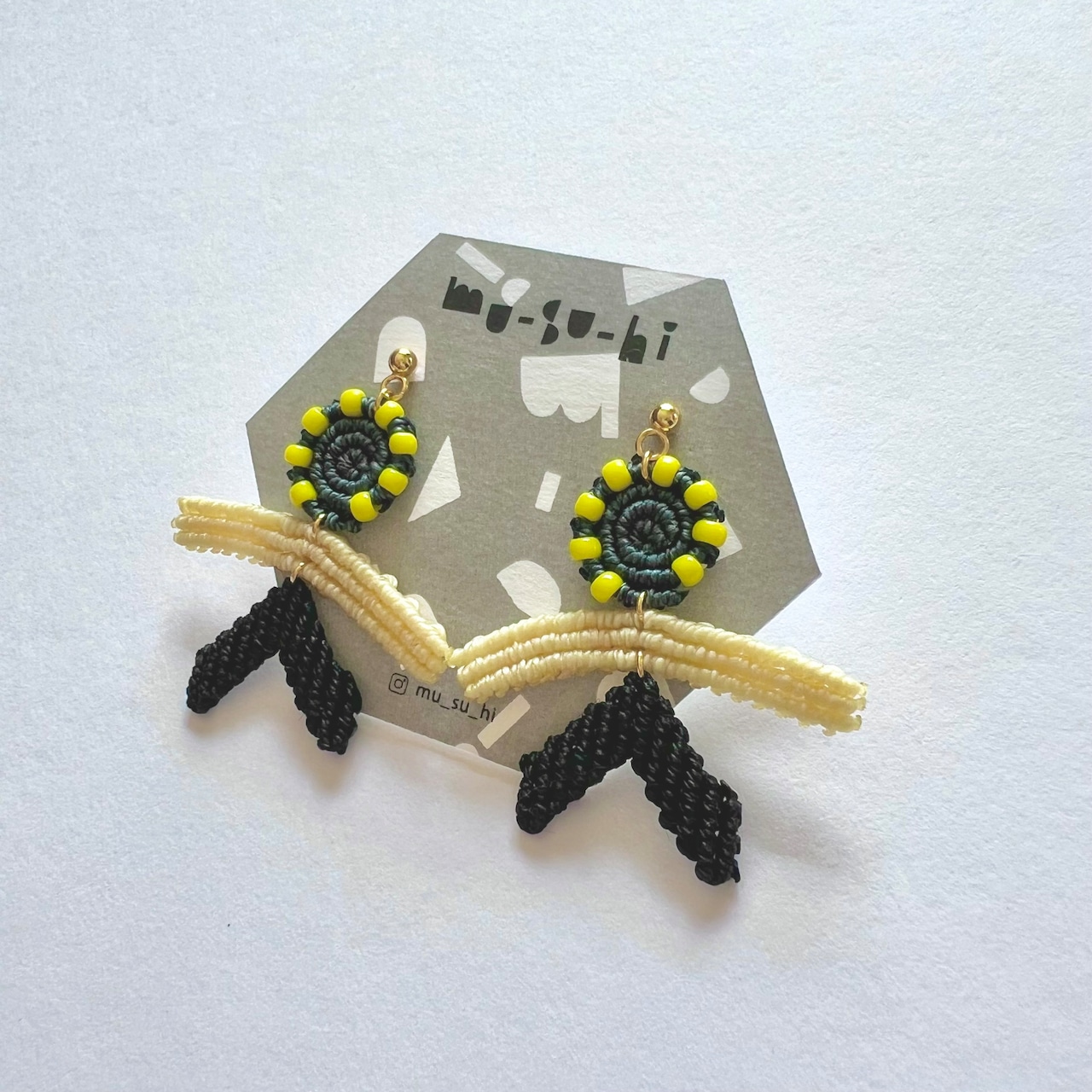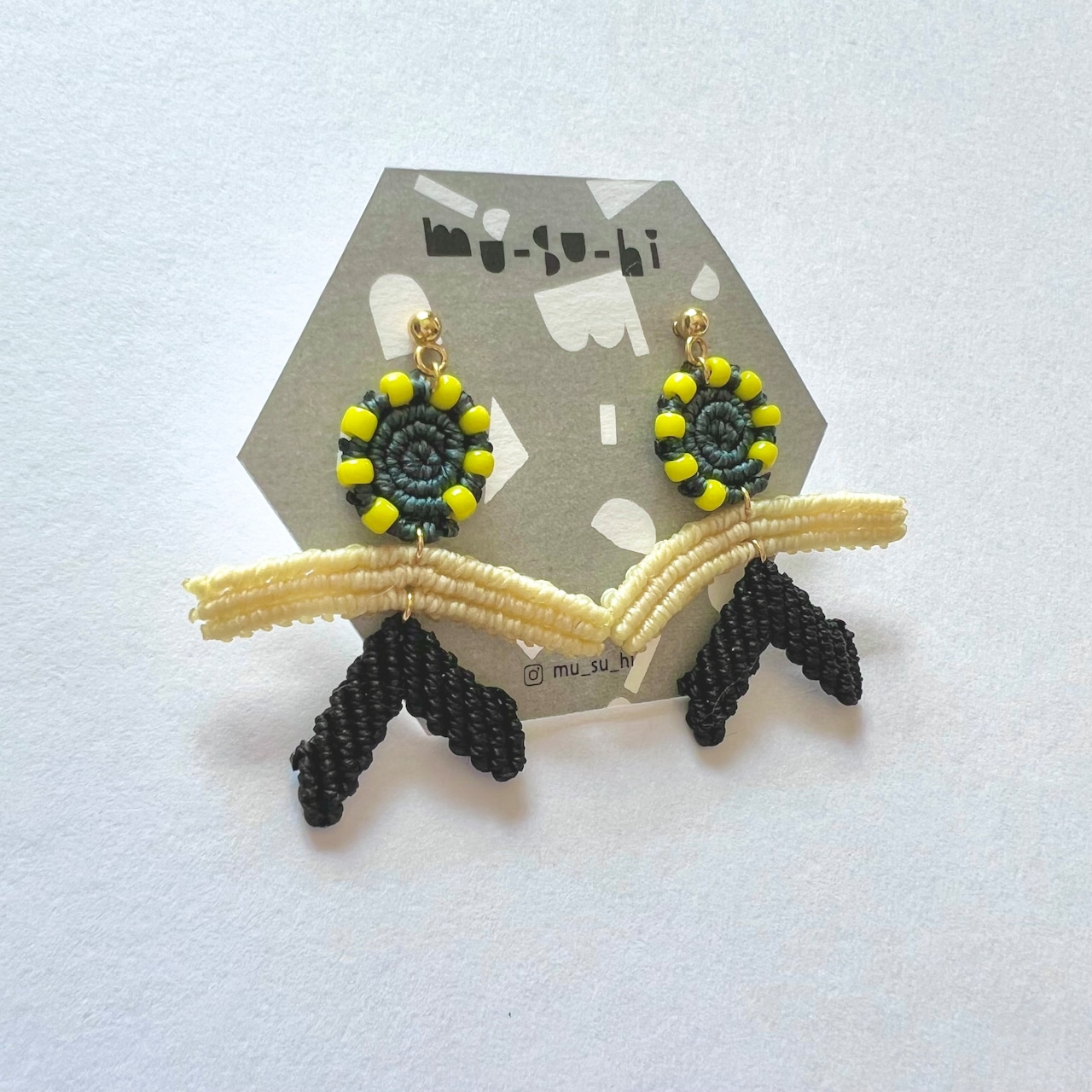 糸とビーズを組み合わせて、マクラメ編みで一つ一つ手編みしております。