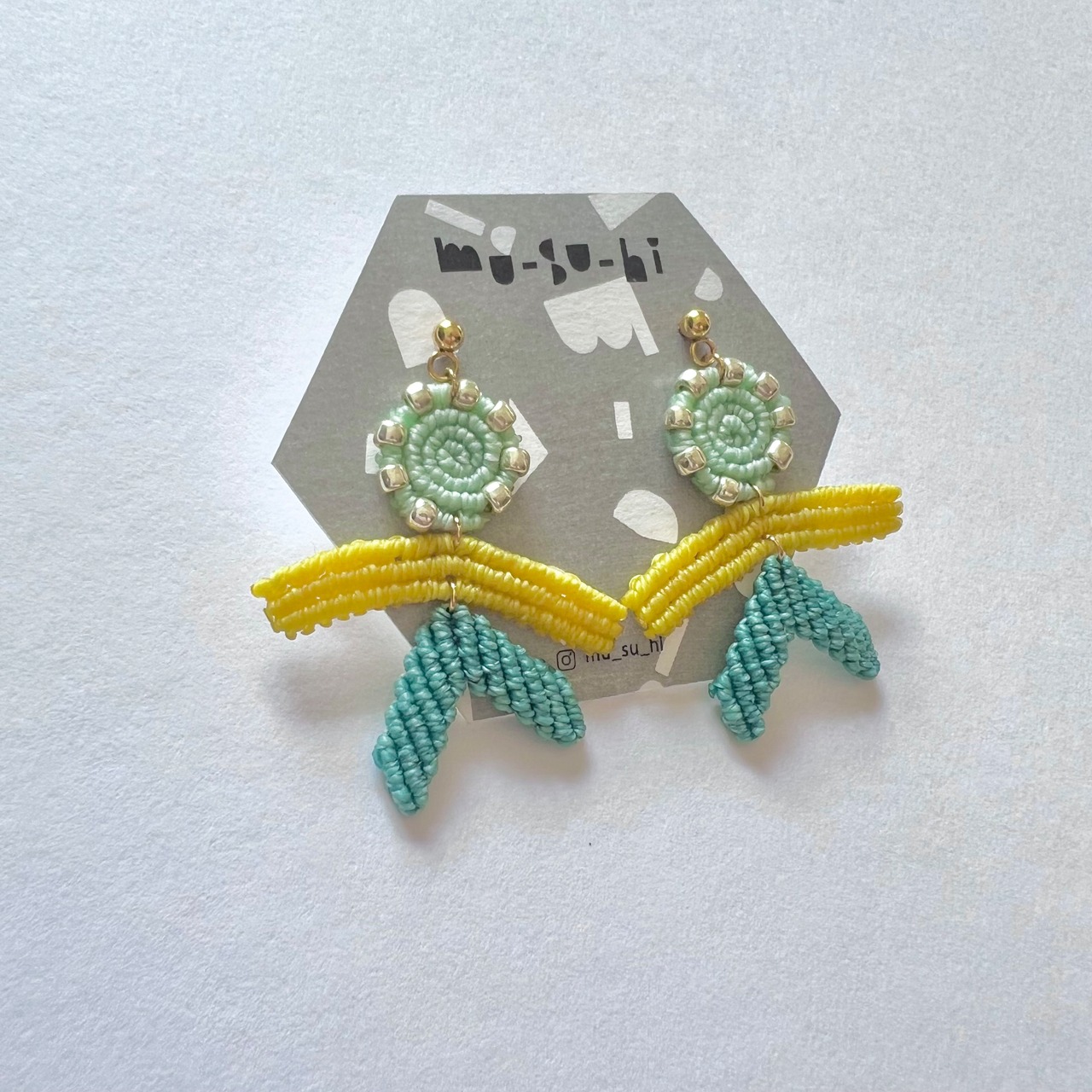 糸とビーズを組み合わせて、マクラメ編みで一つ一つ手編みしております。