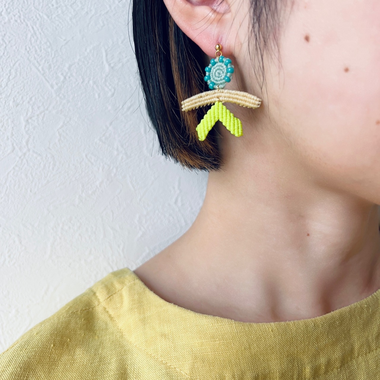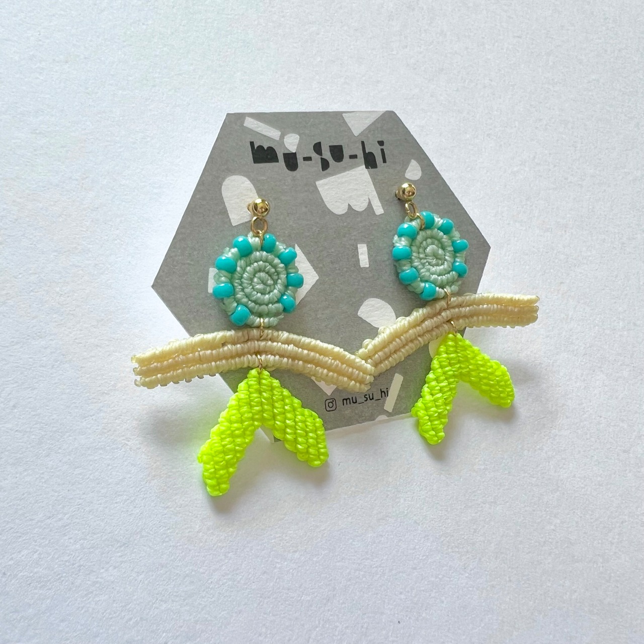 糸とビーズを組み合わせて、マクラメ編みで一つ一つ手編みしております。