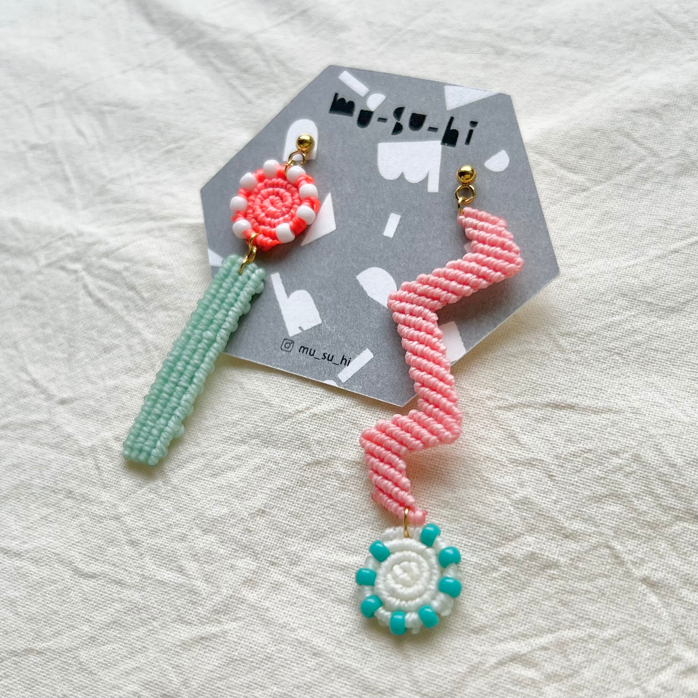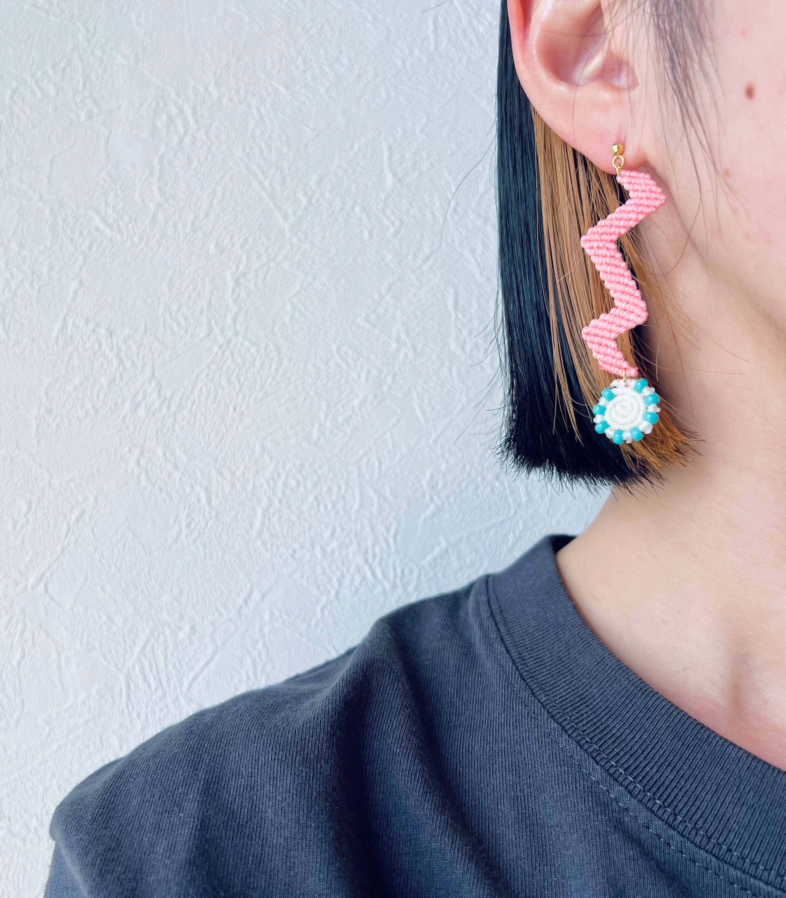 糸とビーズを組み合わせて、マクラメ編みで一つ一つ手編みしております。