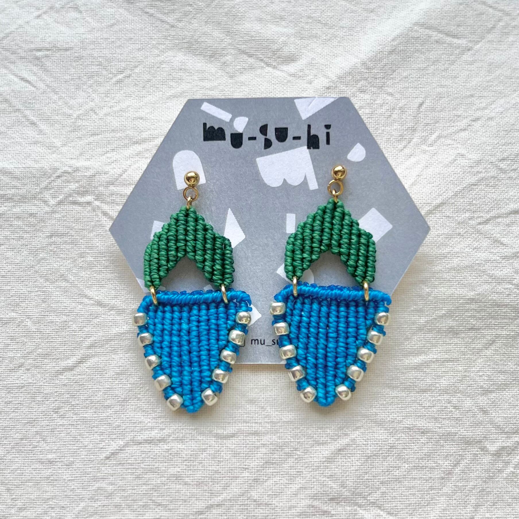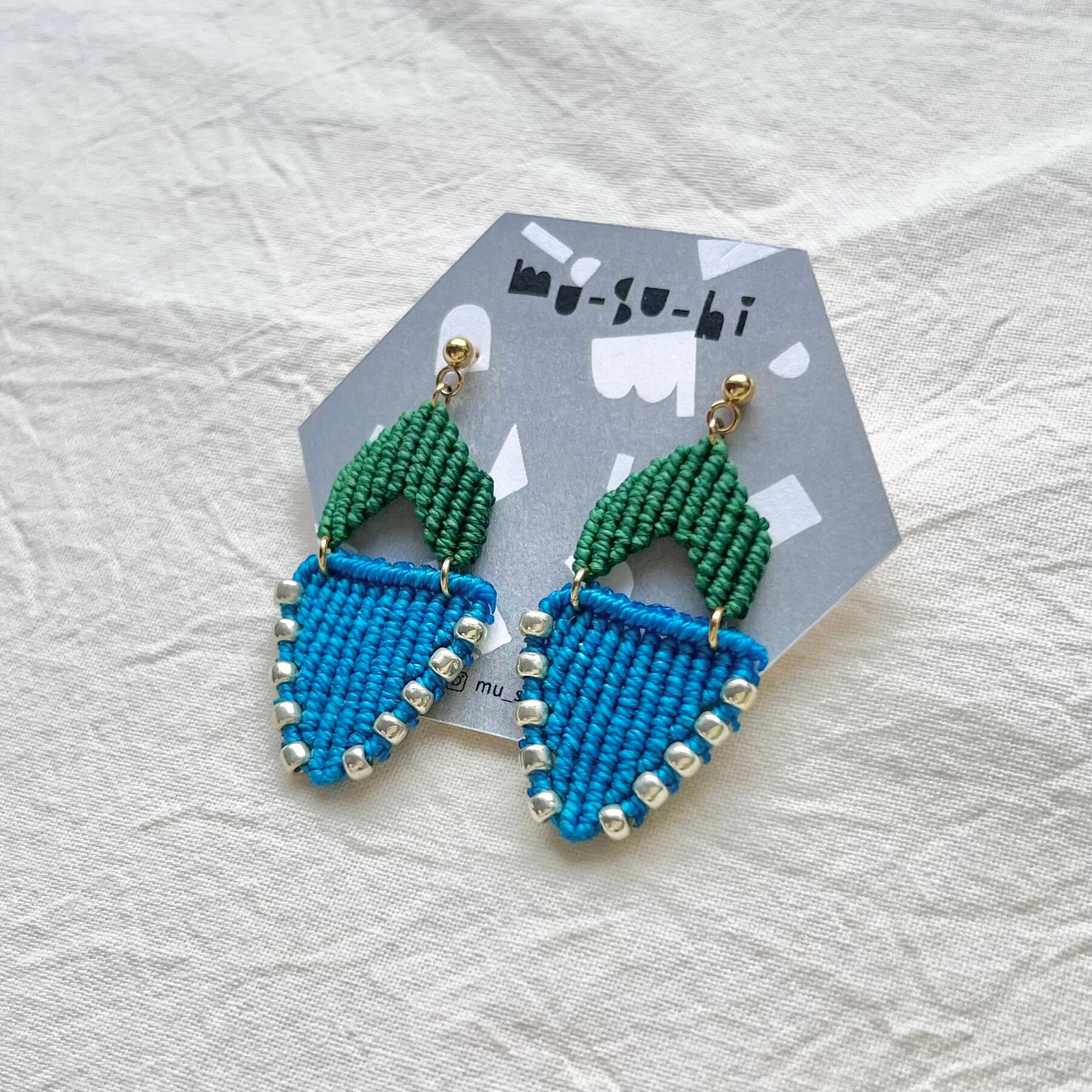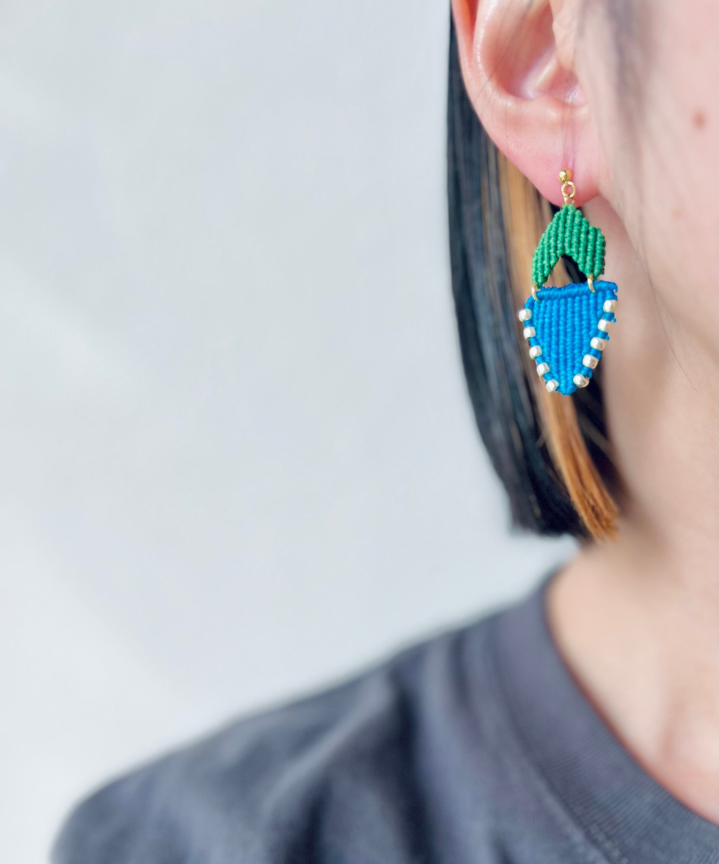 糸とビーズを組み合わせて、マクラメ編みで一つ一つ手編みしております。